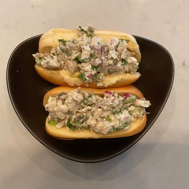 3. Add black pepper, onion, celery, parsley, capers and mayonnaise to bowl and mix well. Add more salt to taste if needed. Serve on “hot dog” rolls as you would for a lobster roll.